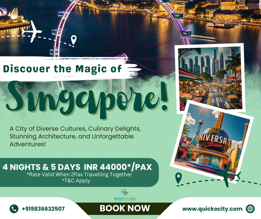 Singapore is a city that never ceases to amaze. From its futuristic skyline to its rich cultural heritage, there’s something for everyone. Book your dream trip with Quick-O-City and experience the magic of Singapore. Visit www.quickocity.com to learn more and start planning your adventure today!